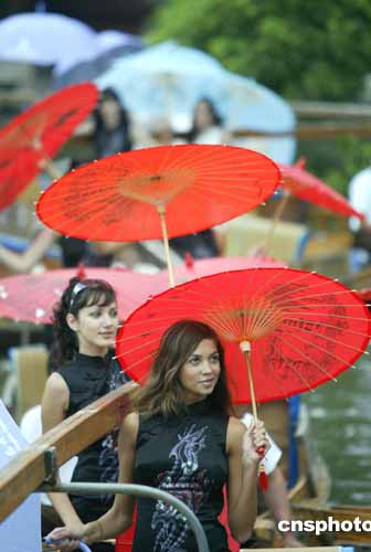 8月31日,參加“時尚杭州之旅”2004年新絲路世界模特大賽的29個國家和地區的40多名參賽佳麗在浙江省杭州乘木船、撐油紙傘泛舟西湖。世界模特大賽決賽將與9月5日在杭州舉行。中新社記者:盛佳鵬
