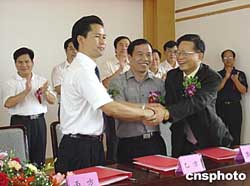 中國—東盟經濟園管委會主任韋志鵬(前左一)與一新入駐企業代表簽約。該區于二○○三年十二月建立,入駐企業逐漸增多。作者:楊志雄