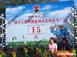 九月一日,在寧夏首府銀川中山公園,“第十三屆中國金雞百花獎電影節”倒計時顯示牌異常醒目。“電影節九月十六日將于銀川開幕,屆時張柏芝、林志炫、閻維文、韓紅、劉歡、騰格爾等眾多的影視明星、當紅歌星及影迷云集銀川。作者:劉呈軍