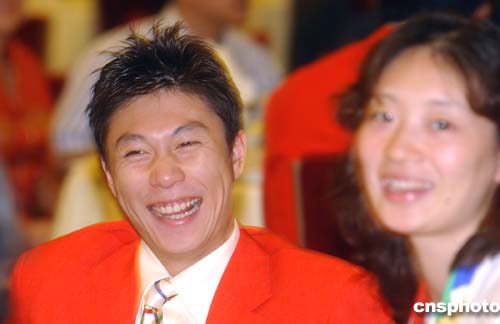 九月二日晚,中共中央辦公廳、國務院辦公廳在北京人民大會堂宴會廳舉行招待會,歡迎載譽歸來的第28屆奧運會中國體育代表團。圖為體操名將李小鵬在招待會上笑逐言開。中新社記者:武仲林