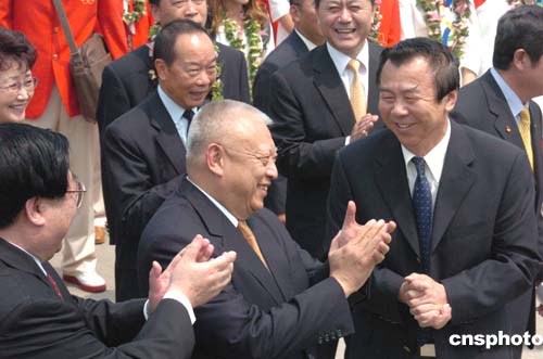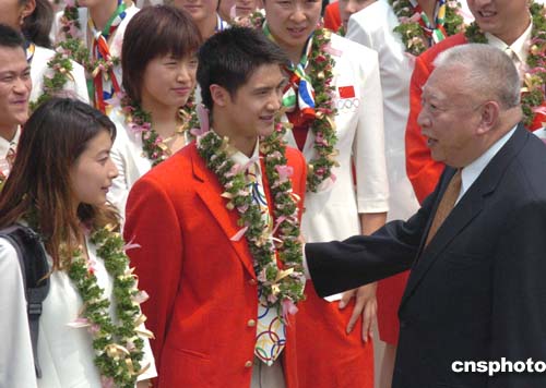 香港特區行政長官董建華到場歡迎以袁偉民為團長的中國奧運金牌代表團訪問香港。中新社記者:錢興強
