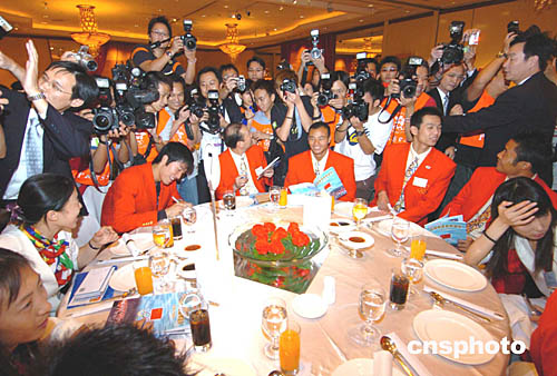 “百一米欄王”劉翔、跳水名將郭晶晶宴會(huì)上忙于簽名,吸引大批傳媒采攝。