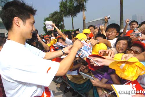 今天早上在香港灣仔金紫荊廣場的金紫荊雕像一樣是金光閃閃,一樣的燦爛奪目,不一樣的是今天這里迎來了一眾重量級的訪客參觀,他們身上散發(fā)的光芒四射與金紫荊一樣耀眼,他們便是中國奧運金牌精英代表團,代表團在廣場與市民握手、簽名,在場市民均雀躍不已并拿起照相機拍下這難忘的一刻。