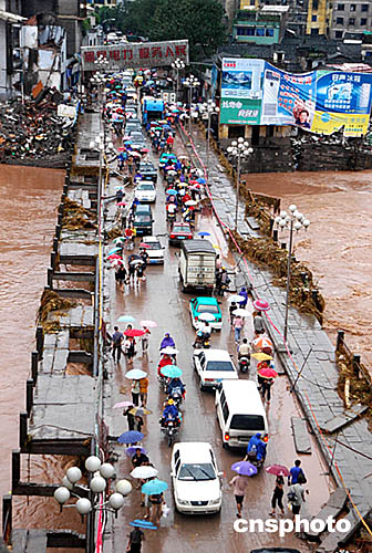重慶開縣由于連日強降水,遭遇了二百年一遇的特大洪災(zāi),造成該縣境內(nèi)五十五個場鎮(zhèn)全部受災(zāi),受災(zāi)人口達八十多萬人,已有十六人在洪災(zāi)中喪生,二十六人失蹤,一百六十八人受傷。目前開縣舊城洪水已退去,被轉(zhuǎn)移的災(zāi)民陸續(xù)返回家中。舊城主要交通要道南河大橋此前被洪水淹沒,并遭部分損壞,如今已恢復(fù)通車。圖為南河大橋穿梭的人群和車輛。作者:邱垡鑫