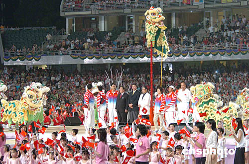 “奧運金牌精英大匯演”7日晚上在香港政府大球場舉行,全場爆滿。圖為醒獅為大匯演展開序幕。作者:洪少葵