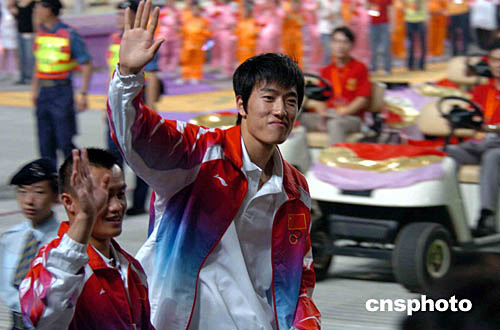“奧運金牌精英大匯演”7日晚上在香港政府大球場舉行,全場爆滿。圖為勇奪奧運田徑110米欄金牌的劉翔進場時向在場人士揮手。作者:洪少葵