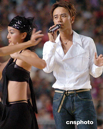為歡迎國家奧運金牌代表團訪港,九月七日香港舉行“金牌精英大匯演”,香港歌星李克勤在“金牌精英大匯演”上演唱。中新社記者:錢興強