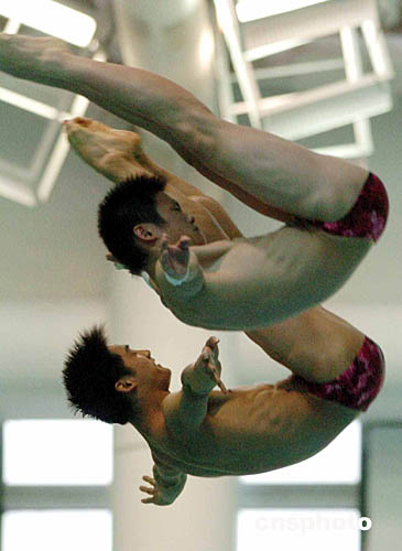 中國奧運金牌選手8日下午在九龍公園作跳水示范表演,游泳池全場爆滿。圖為奧運男子雙人10米高臺冠軍田亮、楊景輝表演高臺跳水。作者:洪少葵