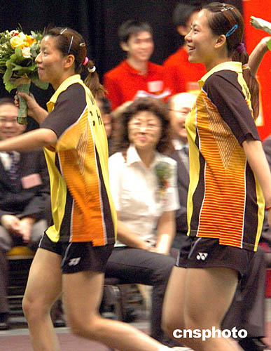 為歡迎國家奧運金牌代表團訪港,九月八日香港舉行“中國人的驕傲--奧運金牌精英顯風采”奧運金牌羽毛球及乒乓球表演。圖為奧運羽毛球金牌運動員將鮮花拋向看臺觀眾。中新社記者:錢興強
