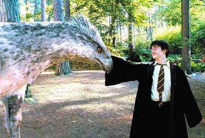 中新網9月9日電 據信息時報報道,在《哈利·波特3》中,出現很多令人驚異的動物包括烏嘴、鷹頭馬身有翼獸、盧平教授秘密的心魔狼人、阿茲卡班的獄卒攝魂怪。還有魔法交通工具騎士公車、膨脹后的瑪姬姑媽、赫敏的寵物歪腿和羅恩所飼養的老鼠斑斑。