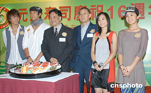 Twins、Boy'Z兩對樂壇人氣組合9月9日在香港出席元綠壽司慶祝十六周年記者會,元綠壽司行政總裁梅偉筠;英皇娛樂老板楊受成與元綠壽司代言人Twins、Boy'Z一同見證元綠壽司生產八億八千八百多萬件之創舉。作者:鄧慶樂