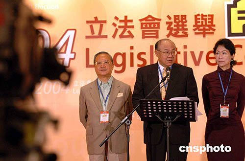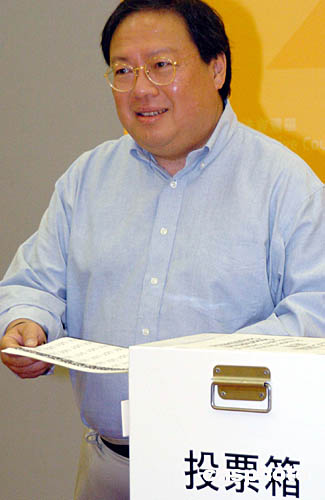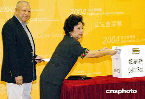 九月十二日,香港舉行2004立法會(huì)選舉投票,民政事務(wù)局局長(zhǎng)何志平來(lái)到香港公園體育館投票站進(jìn)行投票。中新社記者:錢興強(qiáng)