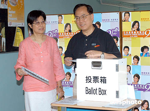 9月12日為香港2004年立法會(huì)選舉投票日,香港政務(wù)司司長(zhǎng)曾蔭權(quán)偕同夫人在山頂僑福道投票站一同投票。作者:鄧慶樂(lè)