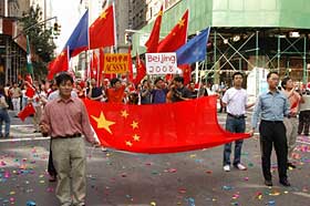 華僑華人和留學生組成了本次游行中人數最多、聲勢最浩大的隊伍,不但有舞龍、舞獅、鑼鼓,還有腰鼓、秧歌以及表現中國京劇藝術、少數民族服裝等傳統文化的表演分隊,許多路邊的觀眾也揮動中國國旗并熱烈鼓掌。