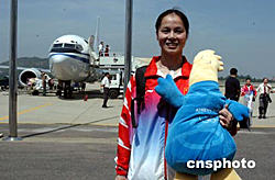 在第二十八屆雅典奧運會上奪得女子蹦床銅牌的閩籍運動員黃珊汕,九月十三日攜雅典吉祥物載譽返閩抵達福州長樂國際機場時,受到福建省各界人士的熱烈歡迎。作者:劉可耕