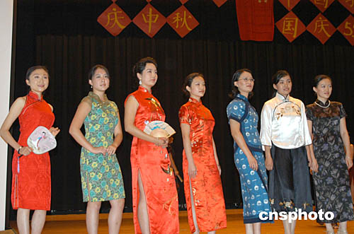 華盛頓的中國留美學生當地時間九月十二日晚舉行聯歡會慶祝國慶55周年,歡度中秋佳節。這是女留學生表演的具有中國民族特色的旗袍秀。作者:余東暉