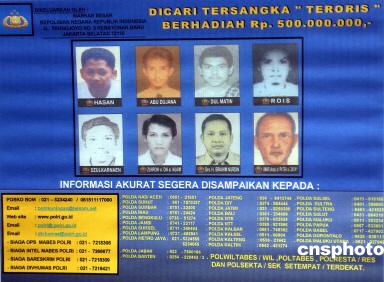 其中,包括在逃的“伊斯蘭團”炸彈專家阿扎哈里·胡辛和恐怖要犯諾丁·穆罕默德·托普,他們分別被懸賞10億印尼盧比亞(約合10萬美元),其他8名嫌犯的懸賞額為5億盧比亞。