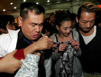 聽說張美人終于要下樓了,門口一片沸騰,當(dāng)張柏芝在幾位隨從人員的簇?fù)硐鲁鰣鰰r(shí),現(xiàn)場炸開了鍋,尖叫聲一浪高過一浪。大家的雙臂熱情地伸向張柏芝,快到門口時(shí),張柏芝身邊一位助手更是把她緊緊摟在懷里,剛到門口,立刻伸過來3只手向張柏芝胸口“進(jìn)軍”,大美女被嚇得花容失色,一位伸手企圖和張柏芝親密接觸的男子更是笑得比花還燦爛。