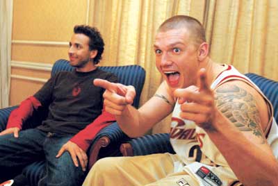 昨天,高大粗壯的Nick和瘦小精干的Howie在兩名保鏢的護衛下出現在北京飯店。跟剛下飛機的時候不一樣,Howie換成了一身短打扮,而高大的Nick則穿著一件籃球背心、運動褲,儼然一位美國NBA的灌籃高手。不過,他的寬大裸露的肩上大片的刺青引起了記者們的注意,特別是圖案中間刺著的兩個漢字——“海神”。跟莊重嚴肅的保鏢顯然不同,他們對媒體記者絲毫沒有敵意,面對鏡頭非常配合地做著各種幽默甚至滑稽的動作和表情。
