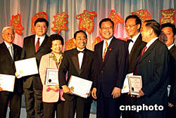 前往祝賀的紐約市長(zhǎng)布隆博格(中)接受華商會(huì)“英雄市長(zhǎng)”的獎(jiǎng)勵(lì)。