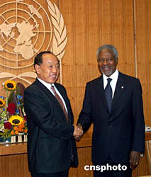 當地時間九月二十七日,正在紐約聯合國總部出席第五十九屆聯大的中國外長李肇星與聯合國秘書長安南會晤,雙方就聯合國作用、改革和發展以及蘇丹達爾富爾等問題交換了看法。作者:趙海燕