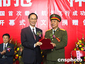 圖為總裝備部副部長張建啟(右)向國家博物館負責人捐贈首次載人航天飛行所使用過的十六件套珍貴文物。