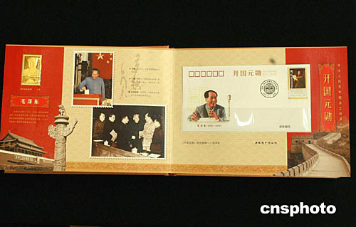 在中華人民共和國成立五十五周年之際,由國家郵政局主辦、中國郵票博物館協(xié)辦的“《開國元勛》金銀郵品典藏冊首發(fā)式九月二十九日在北京人民大會堂舉行。《開國元勛》金銀郵品典藏冊內(nèi)含十五位開國元勛形象的純金銀郵票。其中毛澤東、周恩來、劉少奇、朱德、任弼時、鄧小平、陳云、等七枚金郵票,總含13克999純金;彭德懷、劉伯承、賀龍、陳毅、羅榮桓、徐向前、聶榮臻、葉劍英等八枚銀郵票,總計含16克純銀。中新社記者:鄒憲