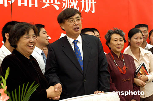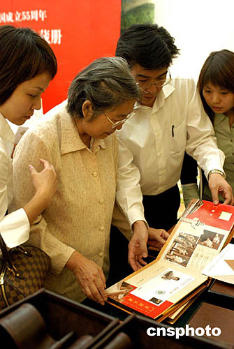 在慶祝中華人民共和國成立五十五周年之際,毛澤東的女兒李敏(左二)及孔繼寧(李敏之子)(左三)、孔東梅(李敏之女)(左一),九月二十九日以開國元勛親屬和嘉賓身份,在北京人民大會堂出席《開國元勛》金銀郵品典藏冊首發(fā)式和新聞發(fā)布會,并一起欣賞這部由中國郵票博物館出版發(fā)行的典藏冊。