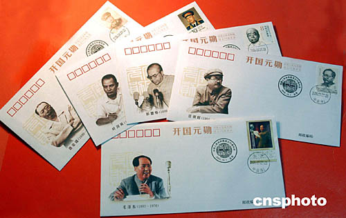 在慶祝中華人民共和國成立五十五周年之際,中國郵票博物館九月二十九日出品發行了一套十五枚《開國元勛》絹質紀念封。《開國元勛》絹質紀念封其中印有毛澤東、周恩來、劉少奇、朱德、任弼時、鄧小平、陳云、彭德懷、劉伯承、賀龍、陳毅、羅榮桓、徐向前、聶榮臻、葉劍英等開國元勛的生活圖象和貼有相應肖像郵票。這套絹質紀念封也被收納在中國郵票博物館于當日發行的《開國元勛》金銀郵品典藏冊之中。中新社記者:鄒憲