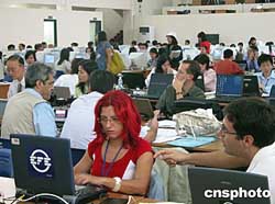圖為在越南第五屆亞歐會議新聞中心內(nèi),眾多記者正緊張工作。中新社記者:吳慶才