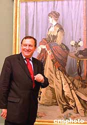 “法國印象派繪畫珍品展”中外記者招待會十月八日在中國美術館舉行。法國奧賽博物館館長勒穆瓦納先生向媒體介紹克勞德·莫奈的作品《戈迪拜爾夫人》。“法國印象派繪畫珍品展”將于十月十一日至十一月二十七日在中國美術館舉行。本次展覽展出法國精選出的51幅具有代表性的印象派作品,它們均出自法國印象派繪畫史上最重要的十四位畫家之手,這也將是中國舉行的水平最高、最為重要的一次西方繪畫作品展。作為“法國文化年”項目的重頭戲,法國國家收藏品中的印象派珍品將于二零零四年十月起,連續六個月在在中國北京、上海、香港展出。作者:張勤