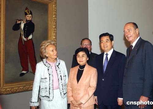 中新社北京十月十日電(記者李靜)“法國印象派珍品展”今天在中國美術館開幕,中國國家主席胡錦濤和在華訪問的法國總統希拉克,以及兩國元首的夫人一道觀看了畫展,法國奧賽博物館館長樂莫瓦納兼任全程解說。