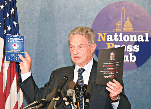索羅斯除了捐款給其它反布什團(tuán)體,自己也斥巨資登廣告出書及巡回演講呼吁選民推倒布什,估計(jì)他個(gè)人為這次大選最終要花二千五百萬美元。這是索羅斯第一次公開大規(guī)模介入美國(guó)選舉。他在其出版的一本反布什的書中說,布什政府中的強(qiáng)硬派正利用恐怖主義的威脅,來追求他們自己想維持美國(guó)軍事優(yōu)勢(shì)的目標(biāo)!岸@種追求,則會(huì)繼續(xù)引發(fā)抵制,啟動(dòng)惡性暴力循環(huán)”。