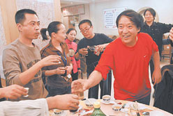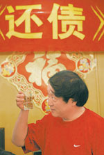 10日晚上,《還債》劇組舉行了開機宴,由于高速公路起霧,牛群從北京趕到石家莊的時候已經是晚上8點鐘。當牛群一臉疲憊地出現的時候,他那已經成為“攝影師、平民縣長”標志的馬甲并沒有穿在身上,而只穿了件紅色T恤和一件運動外套。讓記者感到第二個變化的是牛群的話少了,開機宴上男主角牛群自然少不了講話,人們滿懷期待他能夠講出如相聲般的精彩話語,可牛群只說了兩句客套話便沒了下文,在給各桌敬酒的時候他的話更少,只是端一下酒杯而不開口。