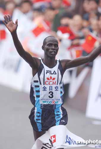 肯尼亞名將莫伊本以2小時(shí)10分34秒的成績,奪得北京馬拉松男子組冠軍。作者:武仲林
