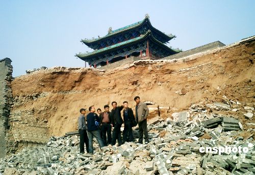十七日中午,山西平遙古城南城門城墻外部分突然坍塌,當地有關部門已緊急在現場布置看守,布置專人保護現場。昨天中午兩點三十分左右,突然一聲巨響,甕城旁的城墻突然向外張裂坍塌,數千塊一尺多寬的青磚瞬間自上而下傾斜下來。作者:張云