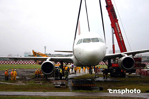 圖為十九日早六點半,工作人員出動吊車搬移事故飛機。中新社記者:張明新