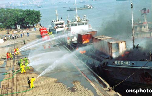 二十日下午三時,廣州港警方首次演練撲救裝載危險品集裝箱船只爆炸事故。圖為消防員手拿滅火器向起火的集裝箱船只噴射泡沫。作者:梁偉成