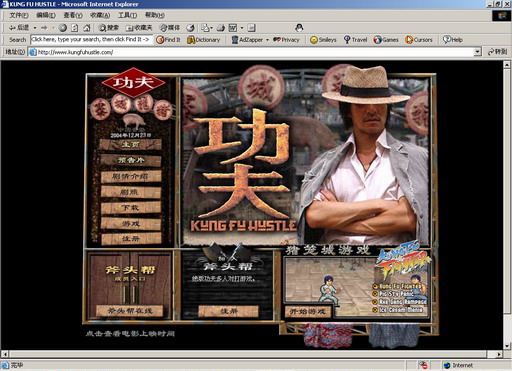 昨日,記者提前進入網站,看到了非常搞笑的預告片片斷———周星馳在豬籠城寨被拿蔥的大嬸痛打一拳。《功夫》英文名為《Kung Fu Hustle》,官方網站為,網站使用三種文字:英語、中文簡體和中文繁體。網站上除了有電影簡介、演員檔案等內容外,還有兩個最新的FLASH游戲“豬籠城寨大亂”和“斧頭幫暴亂”,登記為斧頭幫會員的網友可比賽積分,此后還會加入兩個新游戲“冰淇淋狂熱”和“功夫戰士”。