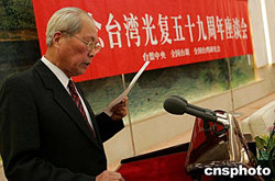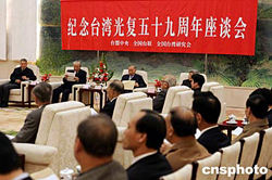 臺(tái)盟中央、全國(guó)臺(tái)聯(lián)、全國(guó)臺(tái)灣研究會(huì)十月二十五日在北京人民大會(huì)堂舉行座談會(huì),紀(jì)念臺(tái)灣光復(fù)五十九周年。中新社記者:毛建軍