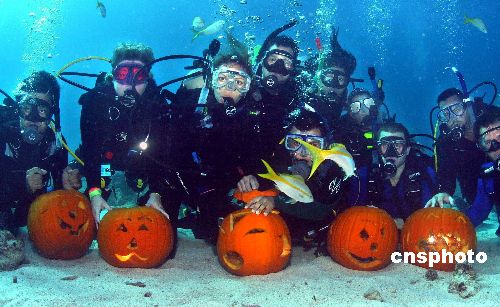 10月25日,在美國佛羅里達州25英尺海底上演了一場別開生面的南瓜雕刻大賽,以此迎接即將到來的萬圣節。Ic/cnsphoto