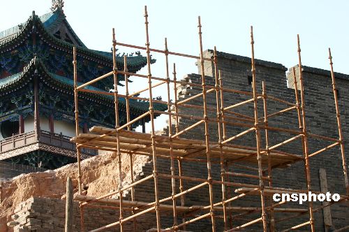 10月17日坍塌的山西平遙古城墻的修復工作于10月26日開始,城墻邊上的腳手架已經開始建立,平遙文物局的工作人員已經開始對城墻的基礎開始進行測量,同時,部分施工人員也于26日進駐工地。作者:魏駿