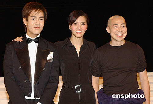 劇中演員詹瑞文、梁詠琪、藍奕邦(右起)為該劇排練