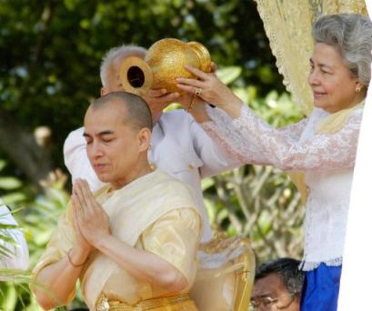 10月29日,在柬埔寨金邊王宮,柬埔寨前國王諾羅敦·西哈努克向其子、新國王諾羅敦·西哈莫尼澆圣水。
