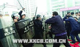 20余人聚集在某市市政府前“鬧事”,110民警迅速趕到現場設立警戒線,阻止“鬧事者”的前進。但情緒激動的“鬧事者”很快便沖破了第一道防線,開始毆打民警。接報趕到的防暴大隊特警手持防暴盾牌進行攔截,設置了第二道防線。為了迅速平息大規模的“騷亂事件”,上級命令使用催淚彈等對“鬧事人群”進行驅散。幾顆催淚彈丟在地上,散出滾滾濃煙。當特警采取防暴隊形圍捕了為首的“鬧事者”后,其余人便立即作鳥獸散去,“危機”終于化解。