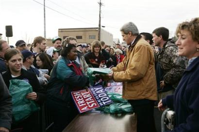 圖為2日當(dāng)天克里在威斯康星州分發(fā)競選宣傳材料的一個場景,克里的一名女支持者手里拿著的雜志,是民主黨總統(tǒng)候選人克里簽過名了的一本競選宣傳資料。(固山)