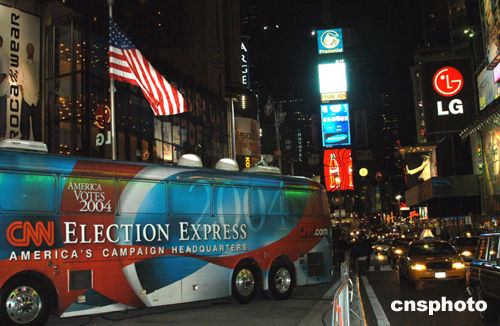 當地時間十一月二日,美國進行總統大選。美國有線新聞網(CNN)將“大選快車”開進紐約時代廣場。作者:趙海燕