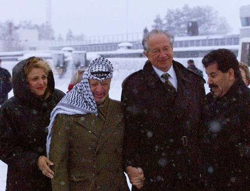 中新網11月12日電 1998年12月5日,阿拉法特訪問瑞典,與瑞典前首相安德森會面,左一為阿拉法特的妻子蘇哈。(春風)