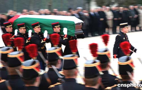 八名法國禮兵抬著阿拉法特的棺木經(jīng)過法軍儀仗隊,走向即將飛往埃及開羅的專機。中新社記者:鐘誠