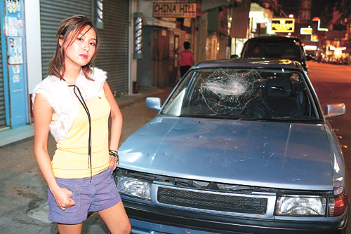 原本導演是要求阿茵執(zhí)起一個大鐵錘大力敲車,但因她不夠力拿起大鐵錘,才改為拿壘球棍。而當日他們乃在車房取景,最初阿茵以為車房地方必定又濕又熱,豈料有冷氣設(shè)備,所以拍攝并不是想象般辛苦。到拍攝時,阿茵因沒氣力打毀車子,便找來兩位朋友幫手,而他們十分投入,甚至連玻璃都打破,幸而四濺的碎玻璃并沒弄傷其它人。阿茵說:“其實我都想趁打爛車子時乘機發(fā)泄一下,可是自己氣力不足,想發(fā)泄也不能。”